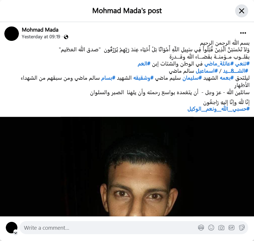In the name of Allah, the Most Gracious, the Most Merciful. And never think that those who were killed in the cause of Allah are dead. Rather, they are alive with their Lord, and they are provided for. “God’s truth is the Greatest.” With hearts that believe in God’s judgment and power, the #Madi family in the homeland and diaspora mourns the #cousin #martyr / #Ismail Salem Madili. He joins his #uncle the martyr #Sulaiman Salim Madi and his brother the martyr #Bassam Salem Madi and all the pure martyrs who preceded them. We ask God - the Almighty - to have mercy on him and to grant us patience and solace. To God we belong and to Him we shall return. #Allah is sufficient for me, and He is the best disposer of affairs.