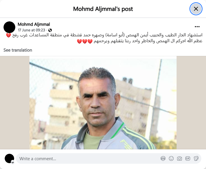 The martyrdom of the kind and beloved neighbor Ayman Al-Hams (Abu Osama) and his brother-in-law Hamad Qishta in the Al-Ma'aida area west of Rafah. May God reward you, Al-Hams family, and we are all one in heart. May God accept them and have mercy on them.