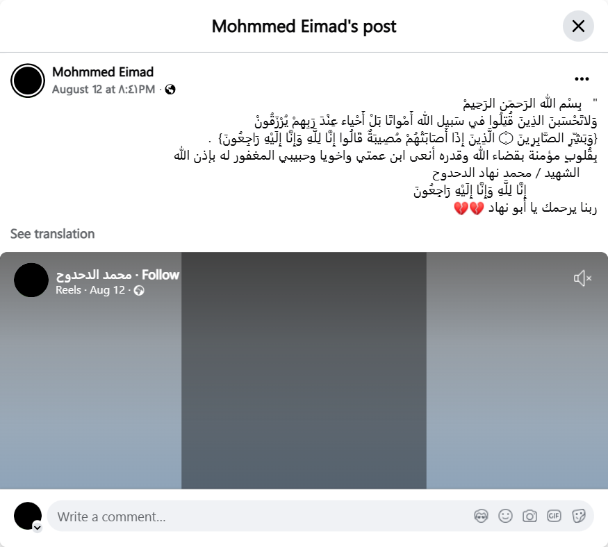 With hearts that believe in God's will and destiny, I mourn my cousin, my brother, and my beloved, may God forgive him,