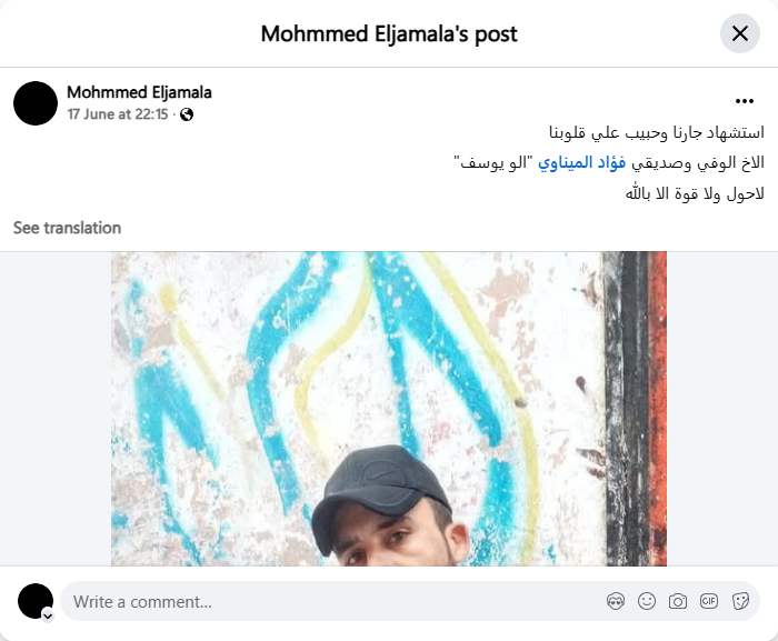 The martyrdom of our neighbor and beloved one, our loyal brother and friend Fouad Al-Minawi "Hello Youssef." There is no power or strength except with God.
