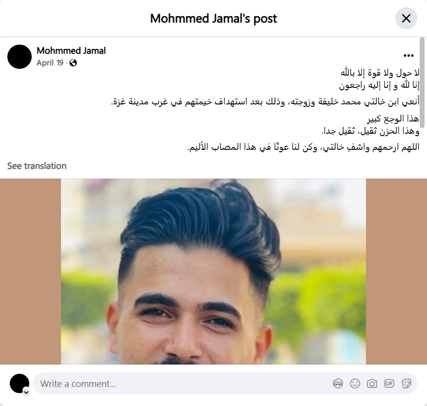 أنعي ابن خالتي محمد خليفة وزوجته، وذلك بعد استهداف خيمتهم في غرب مدينة غز