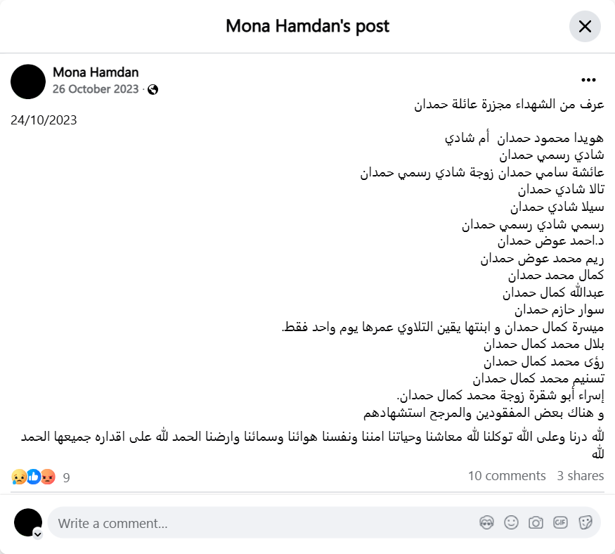 The martyrs of the Hamdan family massacre were identified on 10/24/2023. Howayda Mahmoud Hamdan, mother of Shadi Shadi Rasmi Hamdan, Aisha Sami Hamdan, wife of Shadi Rasmi Hamdan, Tala Shadi Hamdan, Sila Shadi Hamdan Rasmi Shadi Rasmi Hamdan, Dr. Ahmed Awad Hamdan, Reem Muhammad Awad Hamdan, Kamal Muhammad Hamdan, Abdullah Kamal Hamdan, Suwar Hazem Hamdan, Maysara Kamal Hamdan and her daughter Yaqeen Al-Talawi, only one day old. Bilal Muhammad Kamal Hamdan, Roaa Muhammad Kamal Hamdan, Tasneem Muhammad Kamal Hamdan, Israa Abu Shakra, wife of Muhammad Kamal Hamdan. There are some missing and it is likely that they were martyred. God has taught us and in God we trust. God is our livelihood and our life, our security and our soul, our air, our sky and our land. Praise be to God for all his decrees. Praise be to God.