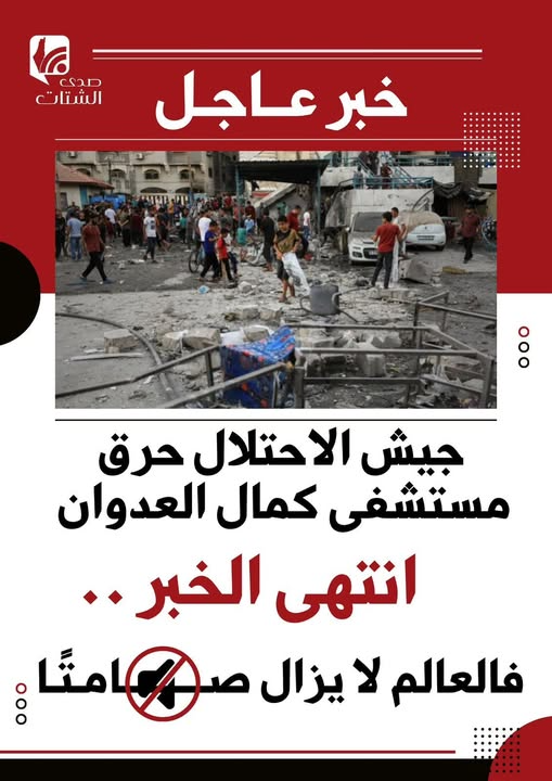 The hospital is burning now... Zionist terrorist gangs (the Nazis of this era) arrest all the hospital staff naked in the middle of this bitter cold and take them to an unknown place.....!! And the patients leave the hospital despite their tragic conditions... Kamal Adwan Hospital in the northern Gaza Strip is facing burning and extermination alone amidst the silence of the Arab and Western world and despicable American and Western complicity......!! Just as Al-Shifa Hospital was left to face the massacre alone, here is Kamal Adwan Hospital facing the same fate... Share on the widest scale Gaza needs us all... Oh our people in Gaza, hope has been cut off except from Allah, the Almighty, the Avenger... And God willing, relief and victory are near...