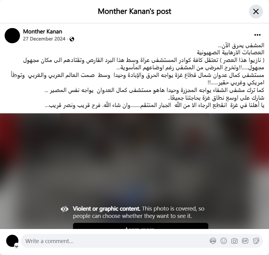 المشفى يحرق الآن... العصابات الارهابية الصهيونية ( نازيوا هذا العصر ) تعتقل كافة كوادر المستشفى عراة وسط هذا البرد القارص وتقتادهم الى مكان مجهول مجهول.....!!وتخرج المرضى من المشفى رغم اوضاعهم المأسوية... مستشفى كمال عدوان شمال قطاع غزة يواجه الحرق والإبادة وحيدا وسط صمت العالم العربي والغربي وتوطأ امريكي وغربي حقير......!!كما ترك مشفى الشفاء يواجه المجزرة وحيدا هاهو مستشفى كمال العدوان يواجه نفس المصير ...شارك على اوسع نطاق غزة بحاجتنا جميعًا..يا أهلنا في غزة انقطع الرجاء الا من الله الجبار المنتقم........وان شاء الله. فرج قريب ونصر قريب...