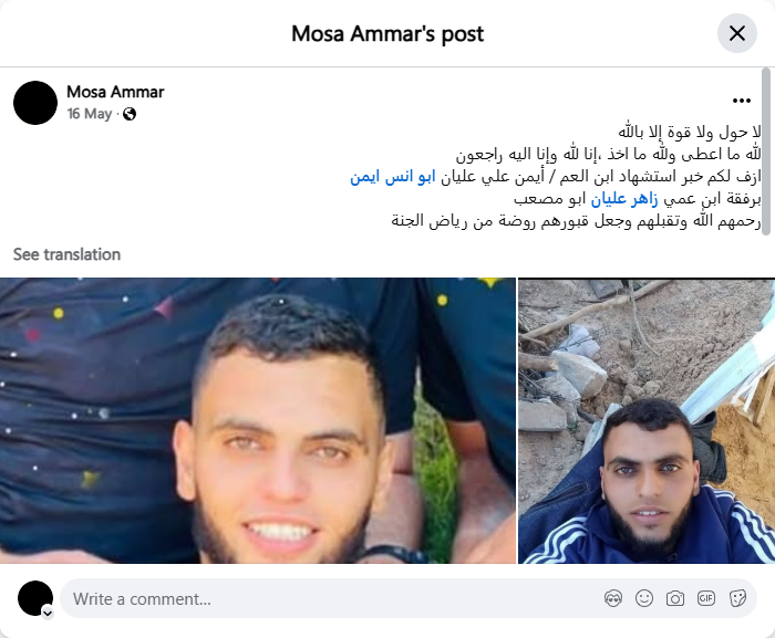There is no power nor strength save with God. To God belongs what He gives and to God belongs what He takes. To God we belong and to Him we shall return. I bring you the news of the martyrdom of my cousin, Ayman Ali Alian, Abu Anas Ayman, along with my cousin Zaher Alian, Abu Musab. May God have mercy on them, accept them, and make their graves a garden from the gardens of Paradise.