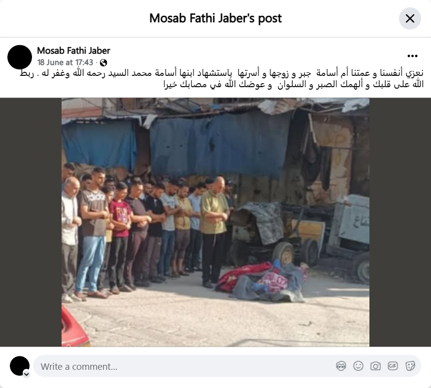 نعزي أنفسنا و عمتنا أم أسامة جبر و زوجها و أسرتها باستشهاد ابنها أسامة محمد السيد رحمه الله وغفر له . ربط الله على قلبك و ألهمك الصبر و السلوان و عوضك الله في مصابك خيرا