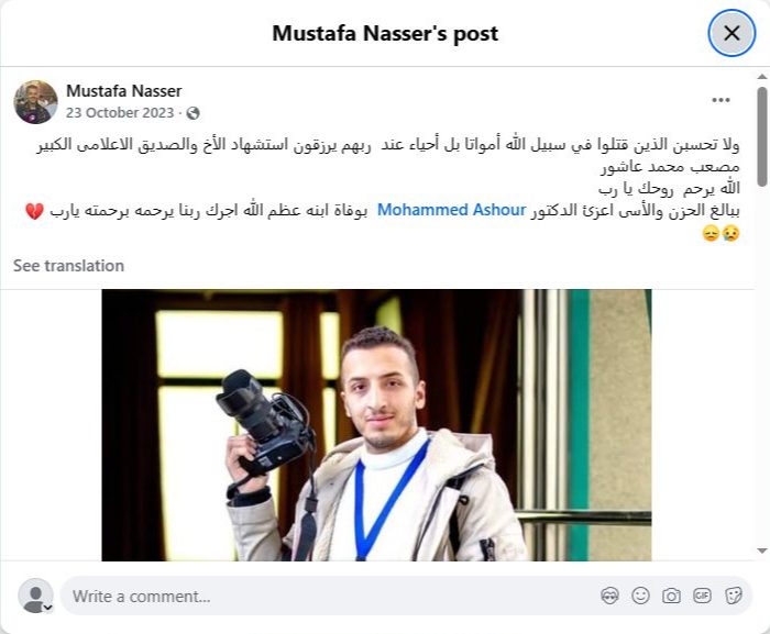 Do not think that those who were killed in the cause of God are dead; rather, they are alive with their Lord, receiving provision. The martyrdom of our brother and dear friend, the great media figure Musab Muhammad Ashour. May God have mercy on his soul. With deep sorrow and grief, I offer my condolences to Dr. Mohammed Ashour on the death of his son. May God grant you patience and reward you for your loss. May God have mercy on him.
