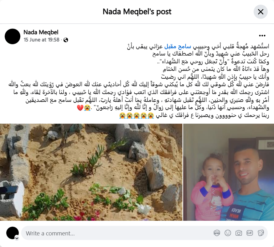 My heart's joy, my brother and beloved Sameh Moqbel, was martyred. My consolation remains that my beloved departed from me as a martyr, and that God chose you, Sameh, as you used to call Him, "and that you make my soul with the martyrs." And here God has given him what he wished for, a good ending, and that you, my beloved, are, God willing, a martyr. O God, I am satisfied, so be satisfied with me for God. All my longing for you is for God. Everything that makes me cry with longing for you is for God. All my conversations about you are for God. The compensation is in seeing you. For God, I sold and God bought. May God have mercy on you as much as you hurt me for your companionship that tired my heart. May God have mercy on you, my beloved, and we will meet in the hereafter. To God belongs what I command, and to God belongs my patience and longing. O God, accept his martyrdom and treat him well. As you are worthy of it, my Lord, O God, accept and forgive with the righteous and the martyrs, and it is enough for me that this is a world, and everything in it will perish, and to God we belong and to Him we shall return. May God have mercy on you, my compassionate one, and grant us patience for your separation, my dear.