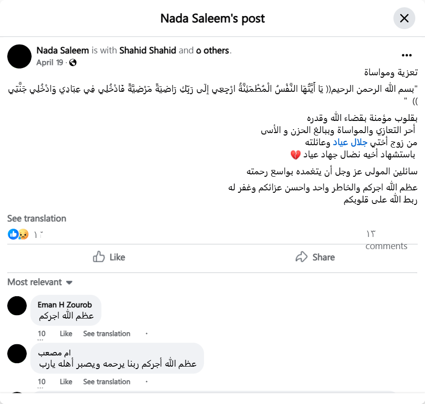 Condolences and sympathy "In the name of God, the Most Gracious, the Most Merciful ((O reassured soul, return to your Lord, well-pleased and pleasing [to Him], and enter among My servants and enter My Paradise))" With hearts that believe in God’s will and destiny, my deepest condolences and sympathy, and with great sadness and sorrow, from my sister’s husband, Jalal Ayyad, and his family, on the martyrdom of his brother, Nidal Jihad Ayyad.
