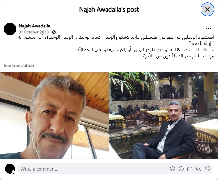 The martyrdom of Palestine TV colleagues Majed Kashko and Imad Al-Wahidi. Al-Wahidi's last post read: "Acquittal of conscience." If anyone has a grievance against me or owes me anything, please inform me or be kind enough to forgive me for the sake of God. Redressing grievances in this world is easier than the afterlife.