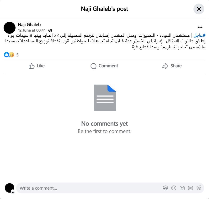 #Urgent | Al-Awda Hospital - Nuseirat: Two injuries were reported to the hospital, bringing the death toll to 22, including 8 women, as a result of Israeli drones launching several bombs at gatherings of citizens near the aid distribution point in the vicinity of the so-called "Netzarim checkpoint" in the central Gaza Strip.