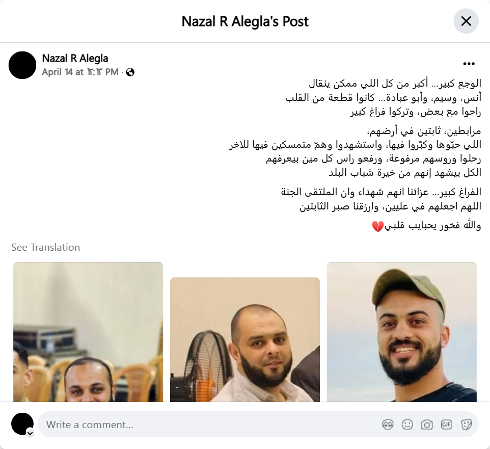 The pain is great… greater than all that can be said Anas, Waseem, and Abu Ubadah… they were a piece of the heart They left together, and left a huge void, steadfast in their land, which they loved and respected, and were martyred while clinging to it until the end They left with their heads held high, and raised the head of everyone who knew them Everyone testifies that they were among the best young men of the country The void is huge… Our consolation is that they are martyrs and that the meeting place is in heaven. O God, place them in the highest place, and grant us the patience of the steadfast. God is proud, my dear ones