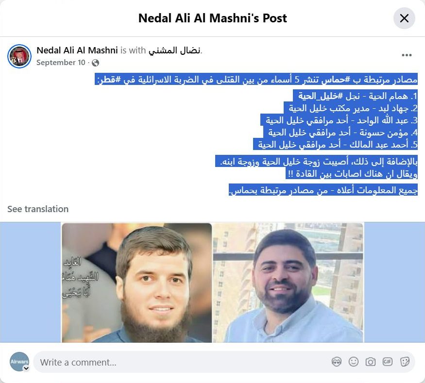 Archive URL: https://airwars.org/source/www-facebook-com-nedal-ali-al-mashni-pfbid02kebiuxmnksj6ihf1hkwy8d5oa6vcwgnk9qt1xahmq4gjajwk25jtyvsnayvccswwl-2025-09-10-090000/