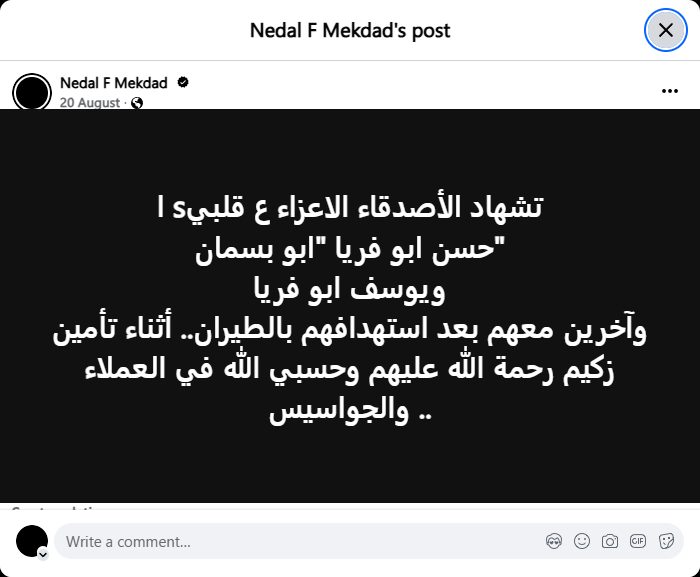 The martyrdom of my dear friends, Hassan Abu Faria "Abu Basman", Youssef Abu Faria, and others with them, after they were targeted by airstrikes while securing Zakim. May God have mercy on them. May God suffice against the agents and spies.
