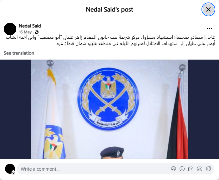 Urgent | Press sources: Beit Hanoun Police Station Chief Lieutenant Colonel Zaher Alian "Abu Musab" and his nephew, young Ayman Ali Alian, were martyred when the occupation forces targeted their home tonight in the Qalibu area, north of the Gaza Strip.