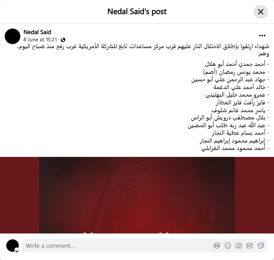 Martyrs who were shot by the occupation forces near an aid center affiliated with the American company west of Rafah since this morning, and they are: - Ahmed Hamdi Ahmed Abu Hilal - Mohammed Younis Ramadan (deaf) - Jihad Abdel Rahman Ali Abu Hussein - Khaled Ahmed Ali Al-Daghma - Amr Mohammed Khalil Al-Bahtini - Fayez Raafat Fayez Al-Attar - Yasser Mohammed Ghanem Shalouf - Bilal Mustafa Darwish Abu Al-Ras - Abdullah Abdul Rabbo Talab Abu Al-Hussain - Ahmed Bassam Attia Al-Najjar - Ibrahim Mahmoud Ibrahim Al-Najjar - Ahmed Mahmoud Mohammed Al-Gharabli