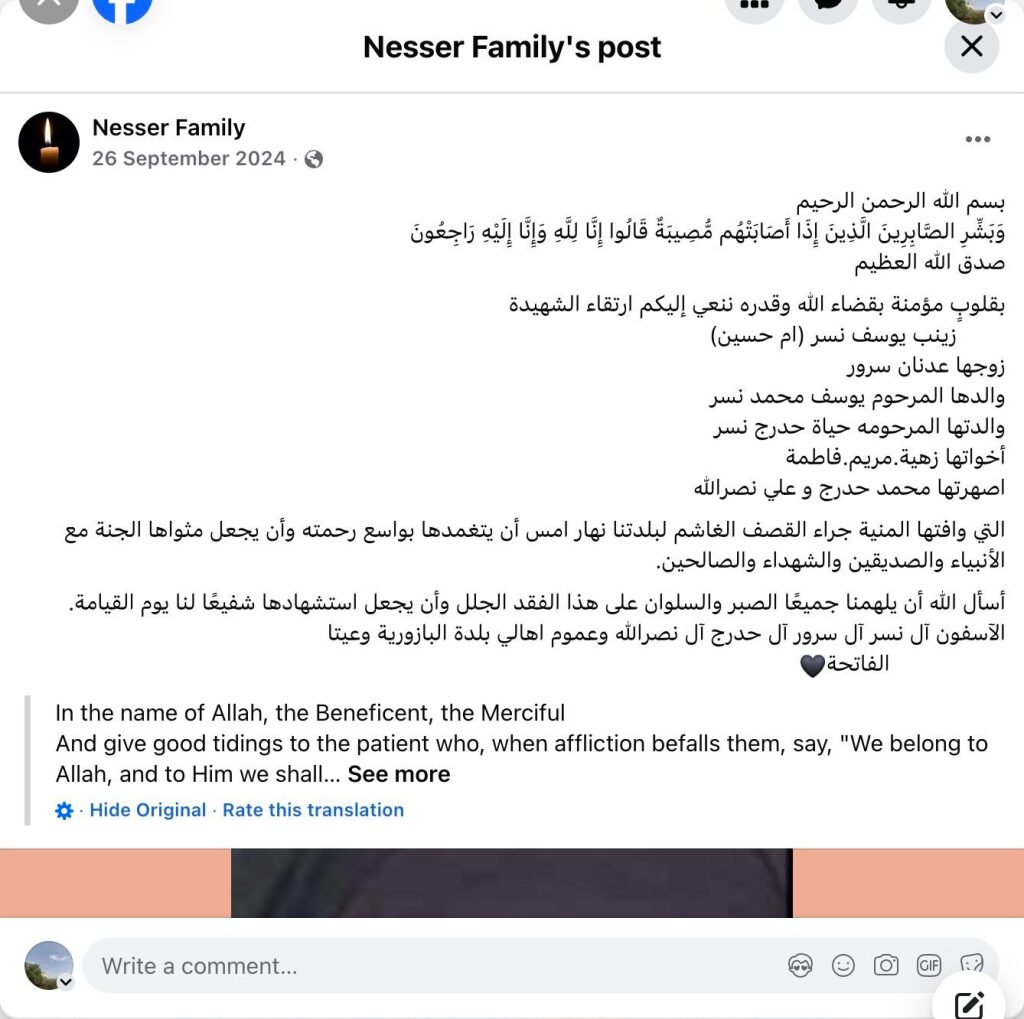 Archive URL: https://airwars.org/source/www-facebook-com-nesser-family-pfbid0ztapstgp7dqlu3skmwqp33vcr6nwet7axmjxqwgzx1jqaq9a4ritwjnbm1x1x9qcl-2024-09-26-110000/
