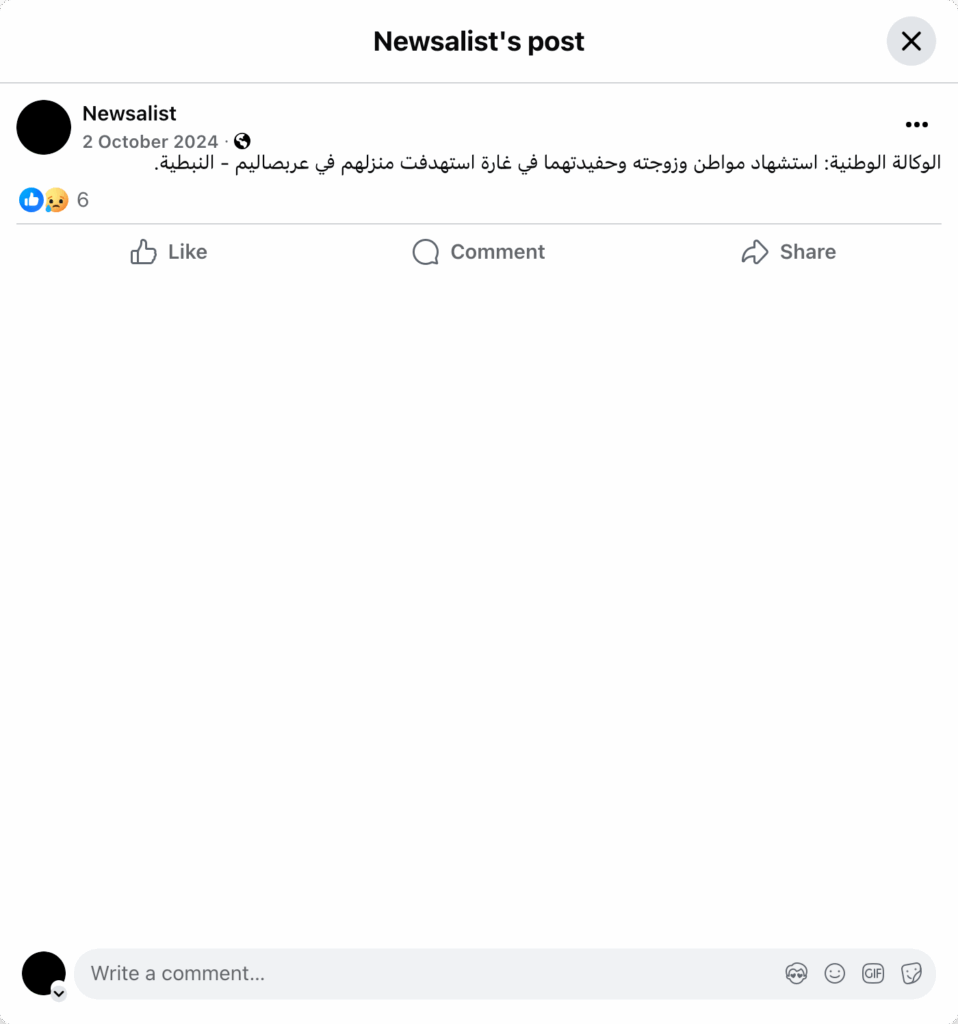 National News Agency: A citizen, his wife, and their granddaughter were killed in an airstrike that targeted their home in Arabsalim, Nabatieh.