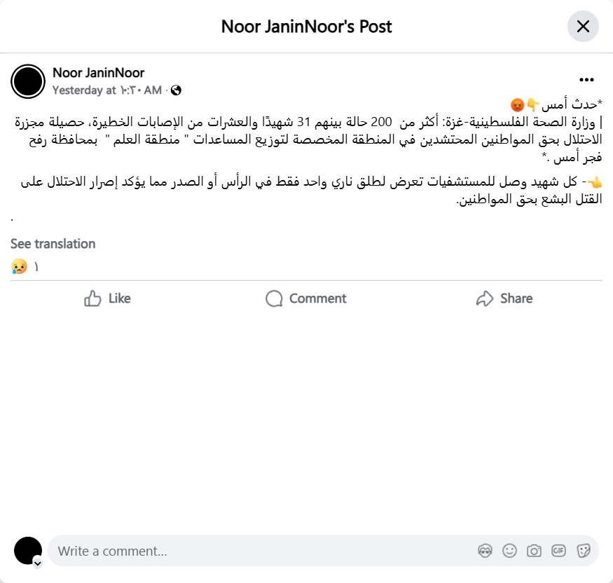| Palestinian Ministry of Health - Gaza: More than 200 cases, including 31 martyrs and dozens of serious injuries, is the result of the occupation's massacre against citizens gathered in the area designated for distributing aid, "Al-Alam area," in Rafah Governorate, yesterday morning.*