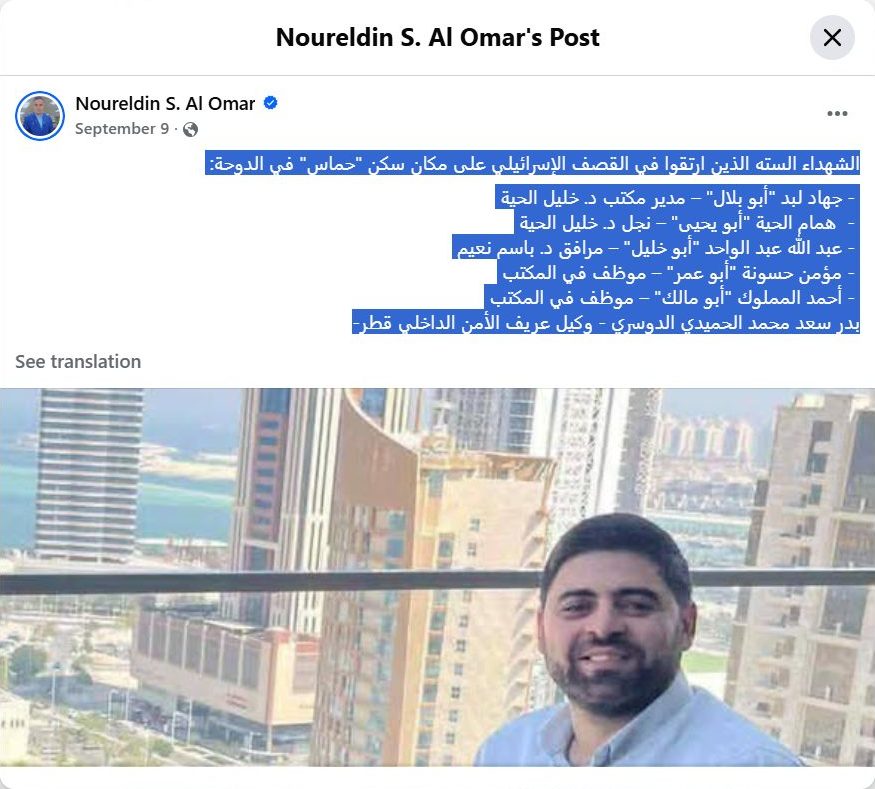 الشهداء السته الذين ارتقوا في القصف الإسرائيلي على مكان سكن "حماس" في الدوحة: