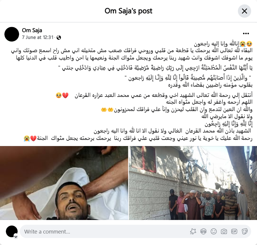 To Allah we belong and to Him we shall return. To Allah we belong and to Him we shall return. May Allah have mercy on you, a piece of my heart and soul. Your departure is difficult. I can’t imagine that I will not hear your voice and that one day I will not see you and see you as a martyr. May Allah have mercy on you and make your abode in Paradise and its delights, O the most compassionate and kindest heart in the whole world. O reassured soul, return to your Lord, well-pleased and pleasing [to Him], and enter among My servants and enter My Paradise. “And those who, when disaster strikes them, say, ‘Indeed we belong to Allah, and indeed to Him we will return.’” With hearts that believe, content with Allah’s will and destiny, the martyr, my brother and a piece of my uncle, Muhammad al-Abd Azara al-Quraan, has passed away to the mercy of Allah. O Allah, have mercy on him and forgive him. May God have mercy on him and make his abode in Paradise. By God, the eyes shed tears and the heart is sad, and we are truly saddened by your departure. We say only what pleases God. To God we belong and to Him we shall return. The martyr, God willing, Muhammad Al-Quraan, the dear. We say only, to God we belong and to Him we shall return. May God have mercy on you, my friend, the light of my eyes. My heart aches for your departure. May God have mercy on you with His mercy and make your abode Paradise.