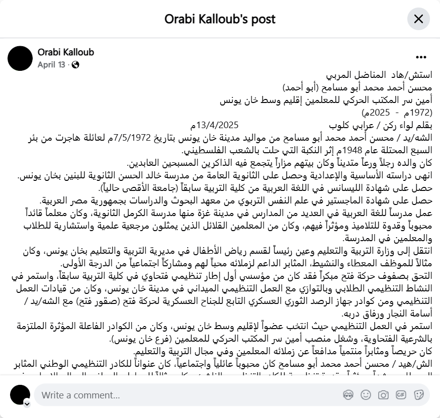 Martyrdom of the struggling educator Mohsen Ahmed Mohammed Abu Musameh (Abu Ahmed), Secretary of the Teachers' Movement Office, Central Khan Yunis Region (1972-2025) Written by Major General / Arabi Kloub 4/13/2025 Martyr / Mohsen Ahmed Mohammed Abu Musameh was born in the city of Khan Yunis on 5/7/1972 to a family that migrated from occupied Beersheba in 1948 following the Nakba that befell the Palestinian people. His father was a pious and religious man, and their house was a shrine where those who remembered, glorified, and worshipped God gathered. He completed his basic and preparatory studies and obtained his high school diploma from Khaled Al-Hassan Secondary School for Boys in Khan Yunis. He obtained a BA in Arabic Language from the former Faculty of Education (currently Al-Aqsa University). He obtained a master's degree in Educational Psychology from the Institute of Research and Studies in the Arab Republic of Egypt. He worked as an Arabic language teacher in several schools in Gaza City, including Al-Karmel Secondary School. He was a beloved leader, a role model, and an influential figure among students. He was one of the few teachers who represented a scientific and advisory authority for students and teachers in the school. He moved to the Ministry of Education and was appointed Head of the Kindergarten Department in the Education Directorate in Khan Yunis. He was an example of a generous, energetic, persevering, supportive, and loving employee who loved his colleagues and was a first-class social participant. He joined the ranks of the Fatah movement early on, as he was one of the founders of the first Fatah organizational framework in the former College of Education. He continued his student organizational activities, in parallel with field organizational work in Khan Yunis. He was one of the leaders of organizational work and one of the cadres of the Revolutionary Military Monitoring Apparatus affiliated with the military wing of the Fatah movement (Fatah Falcons), along with the martyr Osama Al-Najjar and his comrades. He continued his organizational work and was elected as a member of the Central Khan Yunis Region. He was one of the active and influential cadres committed to Fatah legitimacy, and held the position of Secretary of the Teachers' Movement Office (Khan Yunis Branch). He was diligent and persevering, loyal and defending his fellow teachers and those in the field of education. The martyr Mohsen Ahmed Mohammed Abu Musameh was beloved by his family and society. He was a symbol of the persevering and generous national organizational cadre, a mentor, influencer and organizational role model for the emerging organizational cadre. He was an example of a positive, upright national citizen during the displacement that our Palestinian people suffered during the war of extermination waged against us by Israel since October 7, 2023. The martyr Mohsen Ahmed Mohammed Abu Musameh is one of the icons of the authentic Fatah cadre, a virtuous educator, a kind man with a big heart, a good reputation and high morals, honest and generous, clean-handed, chaste of tongue, a man of truth at all times and ages, loyal to his people, his revolution and his homeland. A genuine and stubborn fighter and a distinguished cadre. He was displaced from his home after it was destroyed by Israeli bombing, like the rest of our people in the Gaza Strip. He settled in a tent in the Mawasi area of Khan Yunis, hoping to live there with his family in peace and security for the rest of his life. He shared food with those around him, and even walked dangerous distances to provide bread baked by his wife and some aid to those displaced from Gaza and to those who asked him for protection. He was a kind, loving person who checked on all his friends, prayed for them, and checked on them as one would check on his own children. He lived a life of piety towards his parents and everyone around him. On the evening of Friday, April 11, 2025, he was martyred after the displacement tent in the Mawasi area of Khan Yunis was bombed. On the morning of Saturday, April 12, 2025, he was buried to his final resting place. The funeral procession set off from Nasser Hospital in Khan Yunis towards the Ma'an Cemetery, where he was buried with the participation of the sons of the Fatah movement and the organizational cadres. May Allah have mercy on the martyr, the struggling educator / Mohsen Ahmed Mohammed Abu Musameh (Abu Ahmed) and grant him a place in his spacious gardens. Eng. Jihad Al-Jabour... To Allah we belong and to Him we shall return. The family of the union cadre of the professional movement offices lost one of its leaders, the Secretary of the Teachers' Movement Office / Khan Yunis Region, the honorable brother, distinguished struggler and virtuous educator, the martyr / Mohsen Abu Musameh Abu Ahmed, who was martyred this evening, Friday 4/11/2025 AD, by the bombing of the criminal occupation aircraft on the tent where he was staying in the Mawasi area of Khan Yunis. With this great event, the central movement office and all the branch movement offices for engineers / regions of the southern governorates mourn the deceased and we offer our sincere condolences and sympathy to the union cadre, his family, his loved ones and all the sons of our people who are grieving his departure. To Allah we belong and to Him we shall return. To the eternal gardens, O Abu Ahmed. Ayad Nasr... my dear brother, martyr/Mohsen Abu Musameh "Abu Ahmed"... Oh authentic Fatah member... Oh patriot in whose veins the love of the homeland is rooted, so Fatah was his path to it... Oh my God, how much your departure pained me... Oh my God, how shocked I was by your picture and the news of your martyrdom, and how my imagination quickly traveled to your last visit to me during the war, you and beloved Ibrahim, and how the shock brought me back to the sound of your lost laughter today... All of that in silence that hung over me, and I only repeat