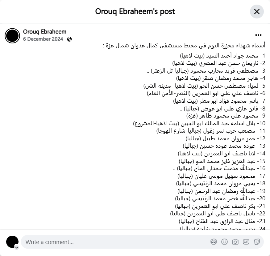 The names of the martyrs of today's massacre in the vicinity of Kamal Adwan Hospital, north of Gaza: 1- Muhammad Jawad Ahmad al-Sayyid (Beit Lahia) 2- Nariman Hassan Abd al-Masri (Beit Lahia) 3- Mustafa Farid Muharab Mahmoud (Jabalia-Tal al-Zaatar) 4- Hajar Muhammad Ramadan Saqr (Beit Lahia) 5- Lamia Mustafa Hassan al-Haw (Beit Lahia-Shi City) 6- Nasif Ali Ali Abu al-Omrain (al-Nasr-General Security) 7- Yasser Mahmoud Fouad Abu Matar (Beit Lahia) 8- Faten Ghazi Ali Abu Awad (Jabalia) 9- Mahmoud Ali Mahmoud Zaher (Gaza) 10- Bilal Osama Abd al-Malik Abu al-Jibin (Beit Lahia-al-Mashru') 11- Musab Harb Nimr Zaqoul (Jabalia-al-Houja Street) 12- Omar Marwan Muhammad Tabil (Jabalia) 13- Awda Muhammad Awda Hussein (Jabalia) 14- Lana Nasif Abu al-Omrain (Beit Lahia) 15- Abdul Aziz Fayez Muhammad Al-Haw (Jabalia) 16- Abdullah Madhat Hamdan Al-Hajj (Jabalia) .. 17- Mahmoud Suhail Musa Alian (Jabalia) 18- Yahya Marwan Muhammad Al-Rantisi (Jabalia) 19- Abdullah Ramadan Abdul Rahman (Jabalia) 20- Abdullah Khader Muhammad Al-Rantisi (Jabalia) 21- Bakr Nasif Ali Abu Al-Omrain (Jabalia) 22- Basil Nasif Ali Abu Al-Omrain (Jabalia) 23- Manal Abdul Razek Abdul Fattah (Jabalia) 24- Yahya Muhammad Mahmoud Shalha (Jabalia) 25- Younis Abdullah Younis Khala (Jabalia) 26- Muhammad Ahmad Juma Ghaben (Jabalia) 27- Farah Muhammad Matar Ghaben (Jabalia) 28- Ahmad Abdul Fattah Abdullah Abu Mahadi (Jabalia) 29- Muhammad Arab Hisham Abu Saif (Jabalia)