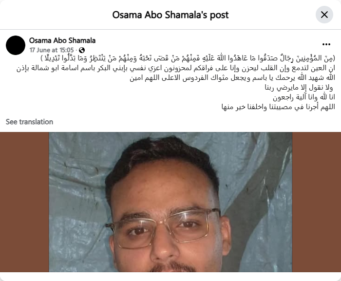 The eye sheds tears, the heart grieves, and we are truly saddened by your departure. I offer my condolences for the loss of my eldest son, Bassem Osama Abu Shamala, God willing, as a martyr. May God have mercy on you, Bassem, and make your abode the highest paradise. Amen.