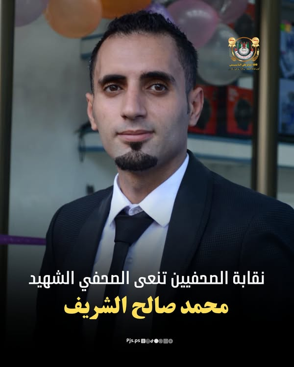 نقابة الصحفيين الفلسطينيين تنعى الزميل الصحفي محمد صالح الشريف (محرر صحفي) الذي استشــهد اليوم السبت في مخيم جباليا عقب استهدافه من قبل طائرة كواد كابتر إسرائيلية.