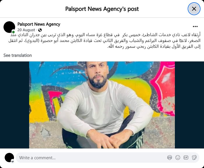 Khamis Bakr, a player for the Beach Services Club, passed away in the Gaza Strip this evening. He was raised within the club's walls since childhood, playing in the youth and junior teams and the second team under the leadership of Captain Mohammed Abu Hasira (Al-Badawi). He then moved to the first team under the leadership of Captain Rabhi Samour, may God have mercy on him.