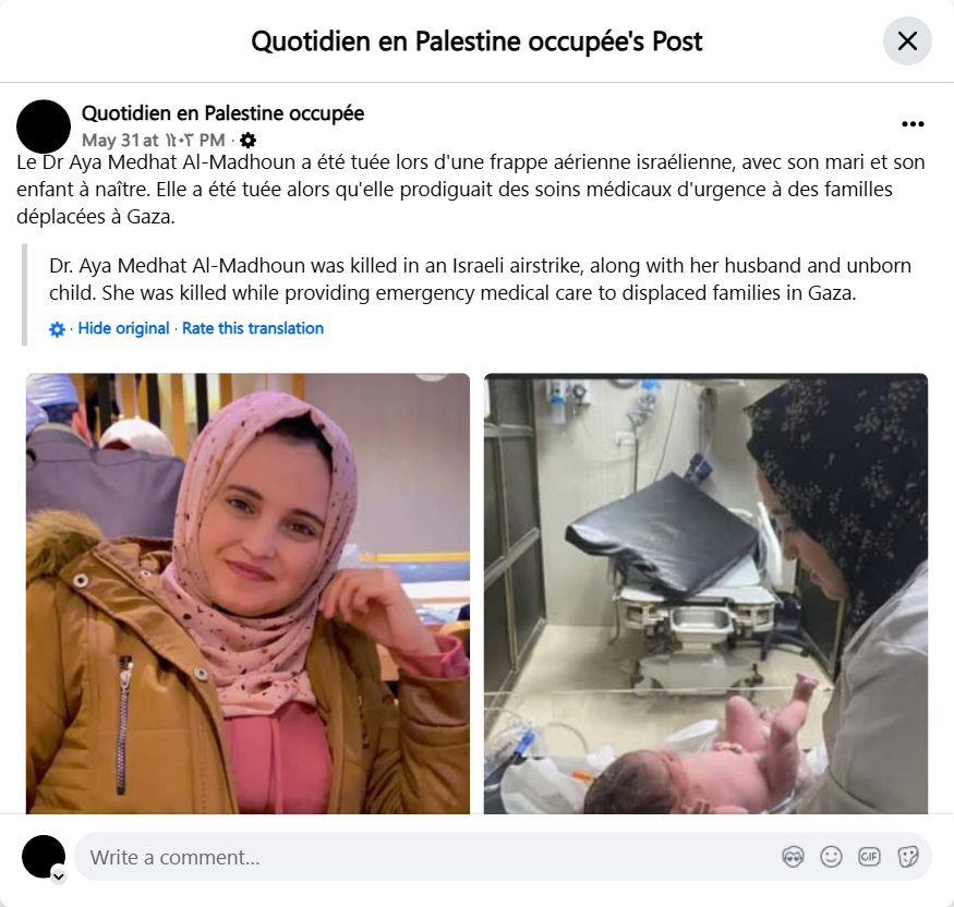 Dr. Aya Medhat Al-Madhoun was killed in an Israeli airstrike, along with her husband and unborn child. She was killed while providing emergency medical care to displaced families in Gaza.