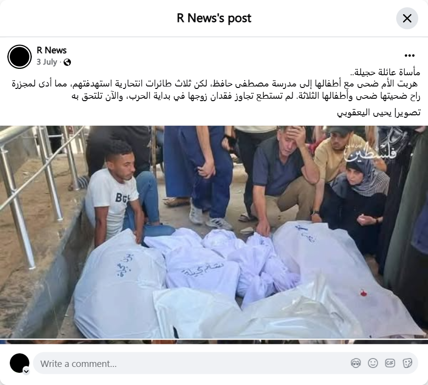 The mother, Douha, fled with her children to Mustafa Hafez School, but three suicide drones targeted them, resulting in a massacre that claimed the lives of Douha and her three children. She was unable to overcome the loss of her husband at the beginning of the war, and now she has joined him.