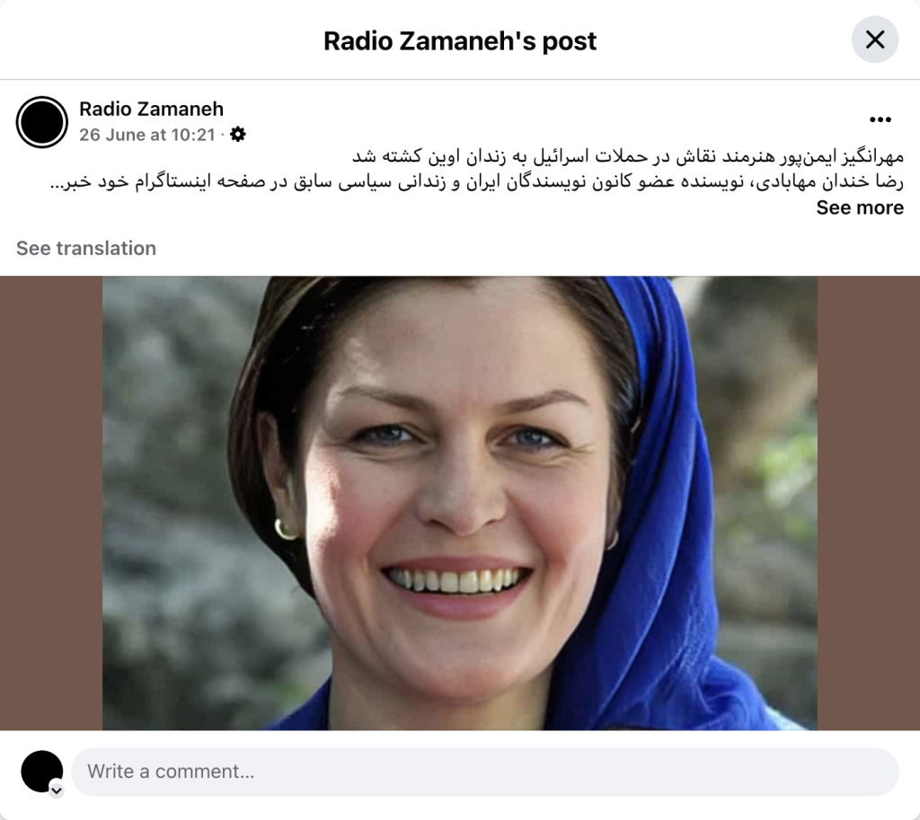 Mehrangiz Aymanpour, a painter, was killed in the Israeli attacks on Evin Prison. Reza Khandan Mahabadi, a writer and member of the Iranian Writers' Association and a former political prisoner, announced the news on his Instagram page… See more