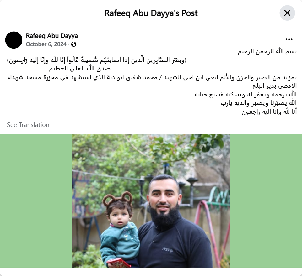 In the name of God, the Most Gracious, the Most Merciful (And give good tidings to the patient, who, when disaster strikes them, say, "Indeed we belong to God, and indeed to Him we will return") God Almighty has spoken the truth. With more patience, sadness and pain, I mourn my nephew, the martyr / Muhammad Shafiq Abu Diya, who was martyred in the massacre of the Al-Aqsa Martyrs Mosque in Deir al-Balah. May God have mercy on him, forgive him and grant him a place in His spacious gardens. May God give us and his parents patience, O Lord. We belong to God and to Him we shall return.