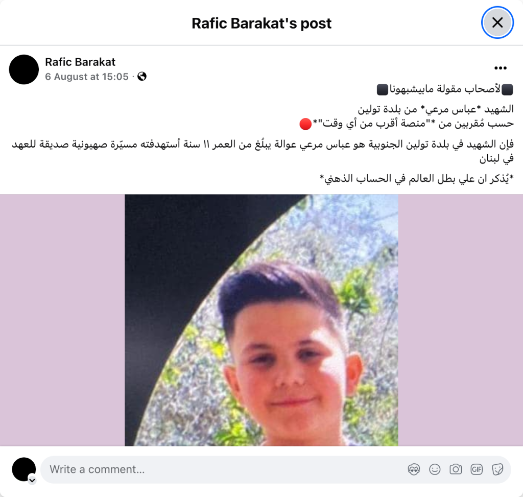 فإن الشهيد في بلدة تولين الجنوبية هو عباس مرعي عوالة يبلُغ من العمر ١١ سنة أستهدفته مسيّرة صهيونية صديقة للعهد في لبنان