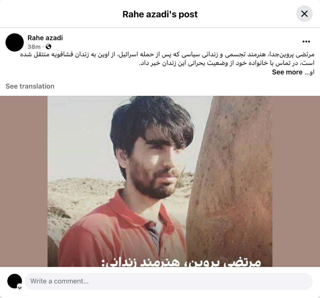Morteza Parvinjeda, a visual artist and political prisoner who was transferred from Evin to Fashafoyeh Prison after the Israeli attack, contacted his family and informed them of the critical situation in the prison. He… See more