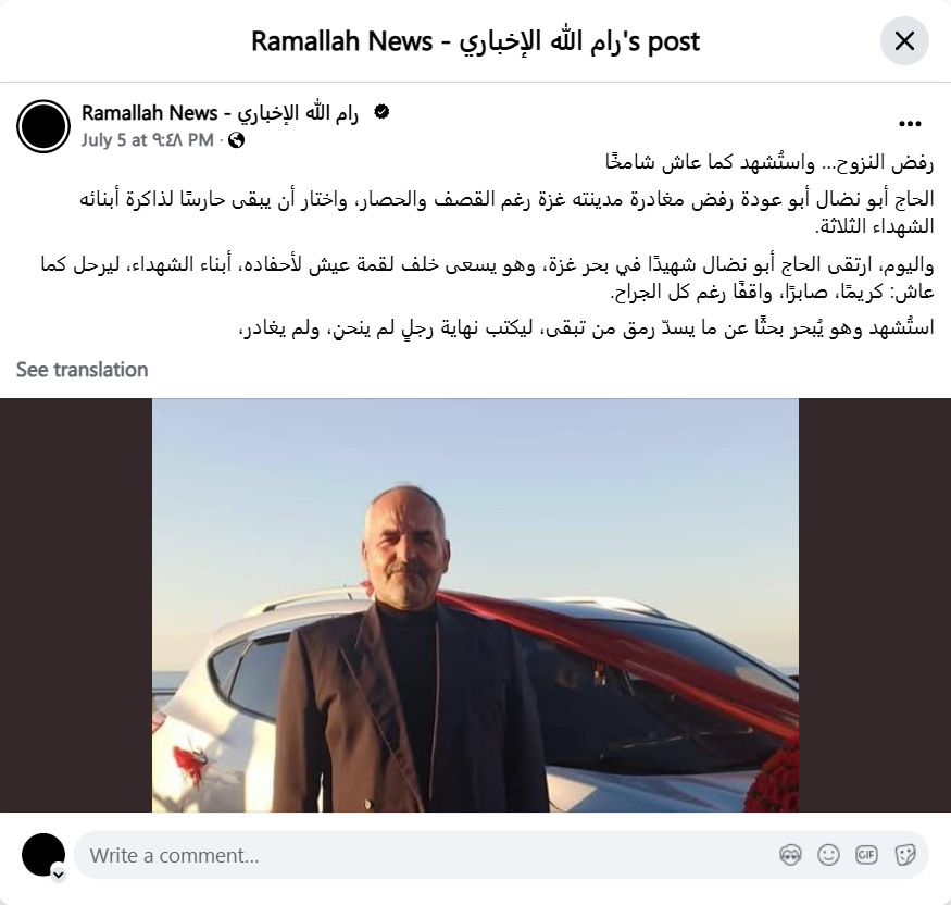 He refused to leave… and was martyred just as he lived proudly. Hajj Abu Nidal Abu Odeh refused to leave his city, Gaza, despite the bombing and siege, and chose to remain a guardian of the memory of his three martyred sons. Today, Hajj Abu Nidal ascended as a martyr in the sea of Gaza, while striving to provide a livelihood for his grandchildren, the sons of the martyrs, leaving just as he lived: generous, patient, and standing firm despite all the wounds. He was martyred while sailing in search of what would satisfy the hunger of those who remained, writing the end of a man who did not bow down, nor leave.