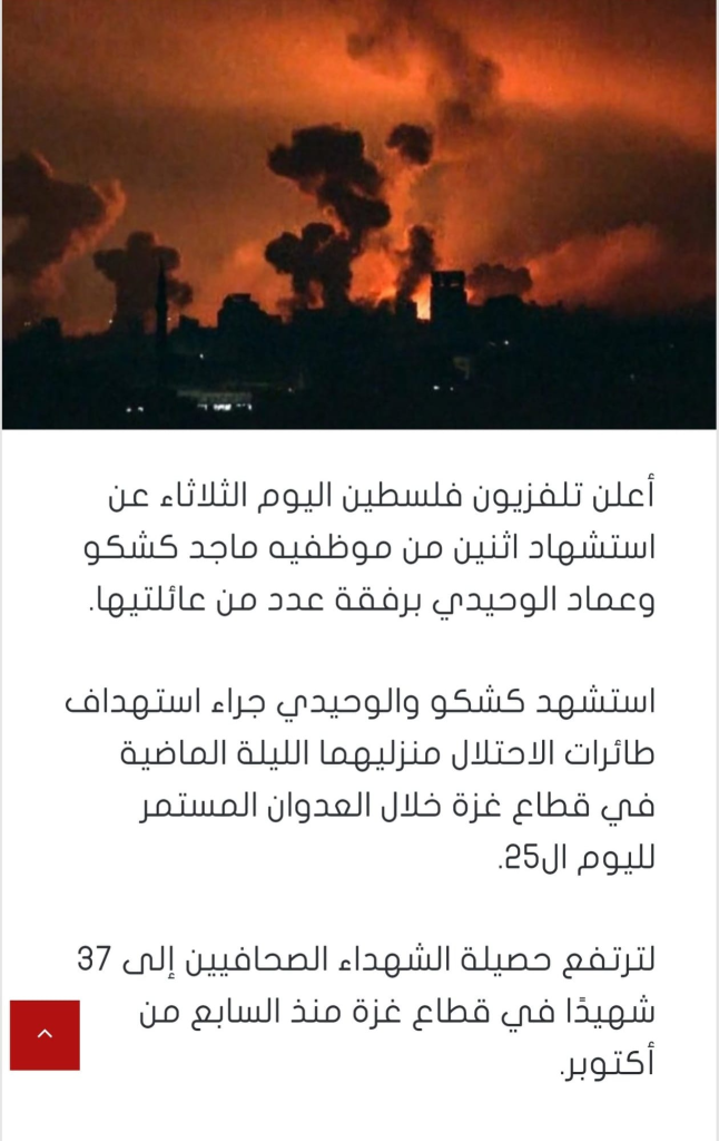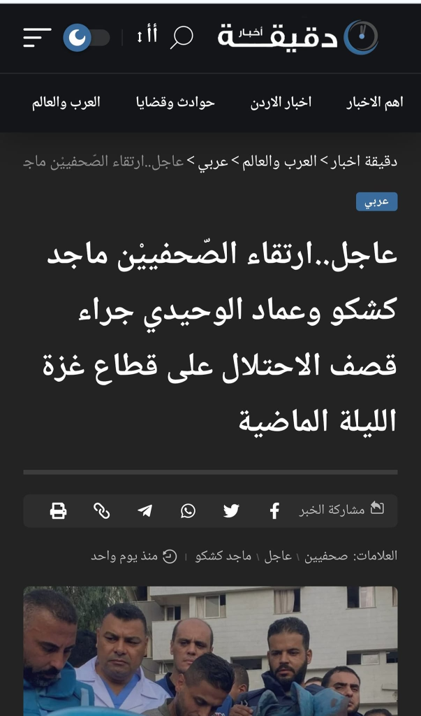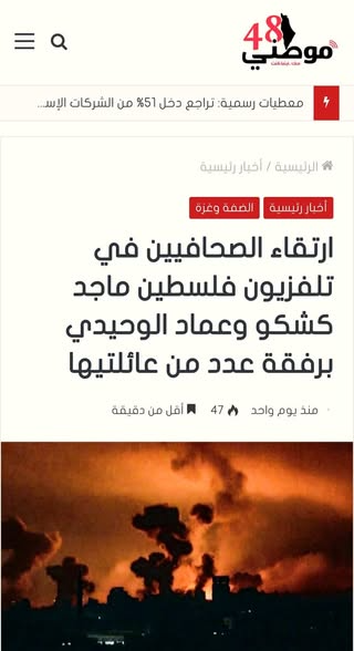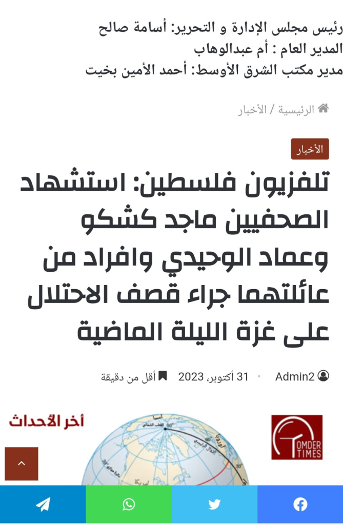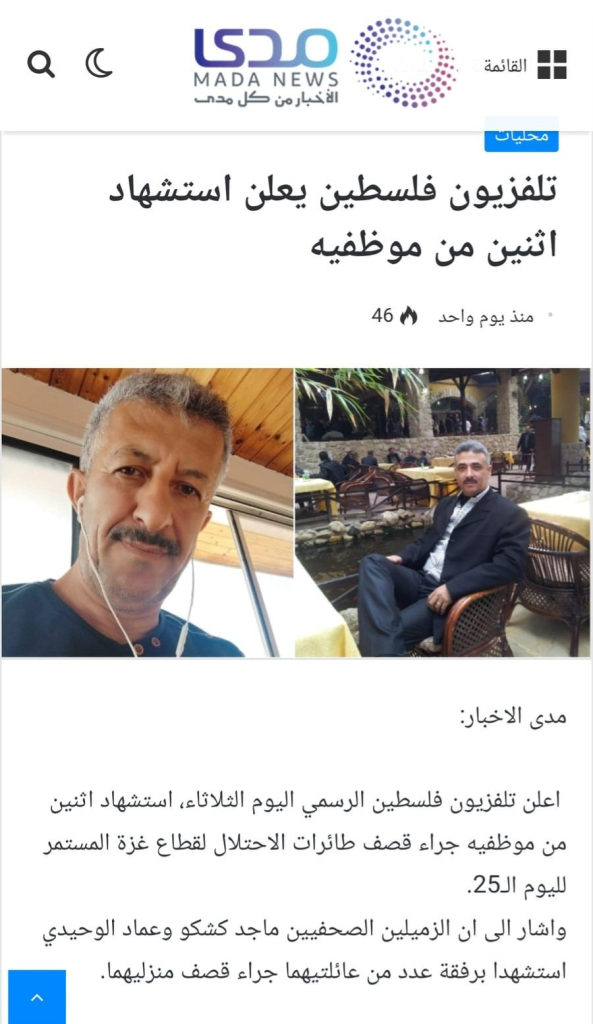الوكالات الاعلامية العربية والدولية تنعي مراسل تلفزيون فلسطين ماجد احمد كشكو في استهدافه هو وجميع افراد العائلة