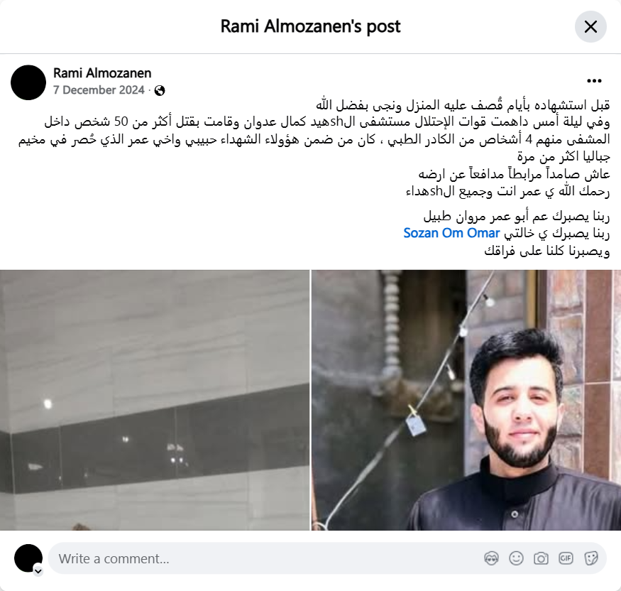 Days before his martyrdom, his house was bombed and he survived, thanks to God. Last night, the occupation forces raided the Martyr Kamal Adwan Hospital and killed more than 50 people inside the hospital, including 4 people from the medical staff. Among these martyrs was my beloved brother Omar, who was besieged in Jabalia camp more than once. He lived steadfastly, defending his land. May God have mercy on you, Omar, and all the martyrs. May God give you patience, Uncle Abu Omar Marwan Tabir. May God give you patience, my aunt Sozan Om Omar, and may He give us all patience for your separation.