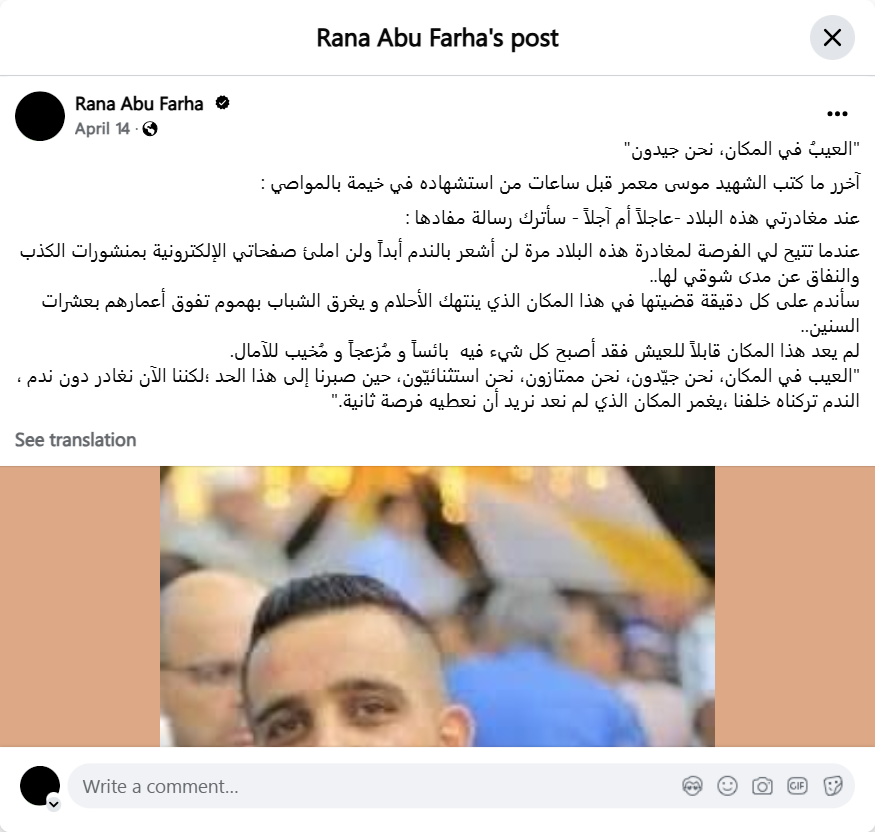 The fault lies with the place, we are good. The last thing written by the martyr Musa Muammar, hours before his martyrdom in a tent in Al-Mawasi: When I leave this country - sooner or later - I will leave a message saying: When I have the opportunity to leave this country once, I will never feel regret, and I will not fill my electronic pages with posts of lies and hypocrisy about how much I miss it. I will regret every minute I spent in this place that violates dreams and drowns young people with worries that exceed their ages by decades. This place is no longer livable, as everything in it has become miserable, annoying, and disappointing. The fault lies with the place, we are good, we are excellent, we are exceptional, when we were patient to this extent; but now we are leaving without regret, the regret we left behind, flooding the place that we no longer want to give a second chance.