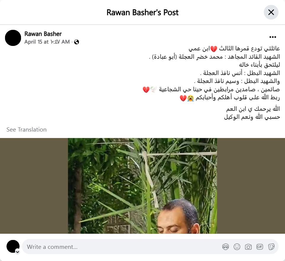 My family bids farewell to its third moon, my cousin, the martyr leader and mujahid: Muhammad Khader Al-Ajla (Abu Ubadah). To join his cousins, the martyr hero: Anas Nafeth Al-Ajla, and the martyr hero: Waseem Nafeth Al-Ajla. Fasting, steadfast, and defending our neighborhood, Al-Shuja'iyya. May God strengthen the hearts of your families and loved ones. May God have mercy on you, cousin. God is sufficient for us, and He is the best Disposer of affairs.