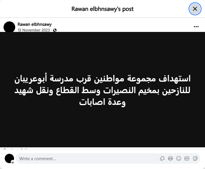 Archive URL: https://airwars.org/source/www-facebook-com-rawan-elbhnsawy-pfbid028qeabpqbhrt5p2snxdlczhnyvnr4bp6kccppwecjeuwutan2m3h53jhe5k8t7gk1l-2023-11-13-090000/