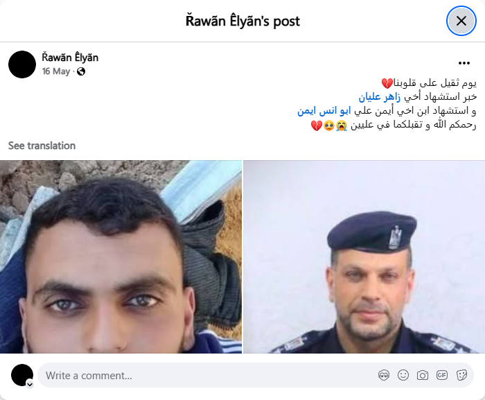 A heavy day for our hearts, the news of the martyrdom of my brother Zaher Alian and the martyrdom of my nephew Ayman Ali Abu Anas Ayman. May God have mercy on you and accept you into the highest heavens.
