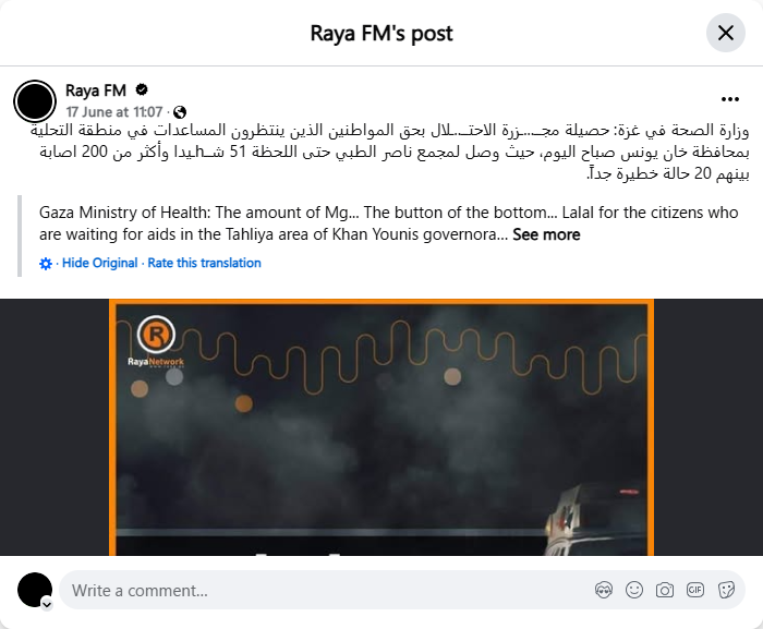 Ministry of Health in Gaza: The death toll from the occupation's massacre of citizens waiting for aid in the Tahlia area in Khan Yunis Governorate this morning. 51 martyrs and more than 200 injuries have arrived at Nasser Medical Complex so far, including 20 very serious cases.