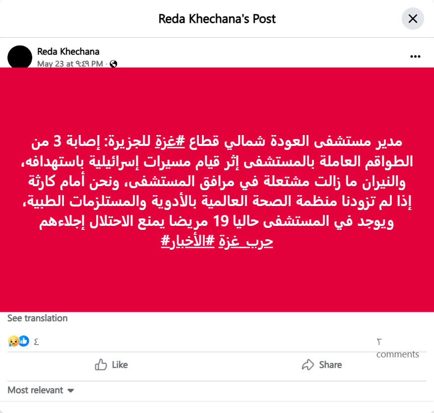 مدير مستشفى العودة شمالي قطاع #غزة للجزيرة: إصابة 3 من الطواقم العاملة بالمستشفى إثر قيام مسيرات إسرائيلية باستهدافه، والنيران ما زالت مشتعلة في مرافق المستشفى، ونحن أمام كارثة إذا لم تزودنا منظمة الصحة العالمية بالأدوية والمستلزمات الطبية، ويوجد في المستشفى حاليا 19 مريضا يمنع الاحتلال إجلاءهم