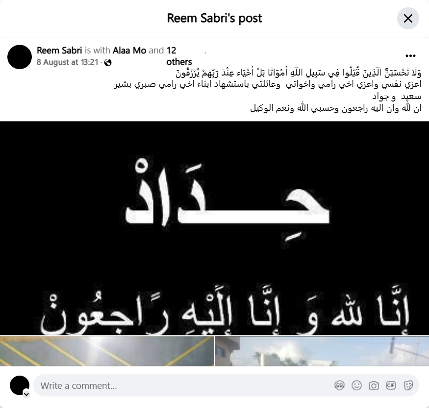 I offer my condolences to myself, my brother Rami, my sisters, and my family for the martyrdom of my brother Rami's sons, Sabry Bashir