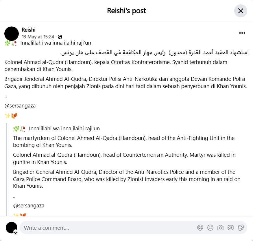 Colonel Ahmad al-Qudra (Hamdoun), head of the Counterterrorism Authority, was martyred in a shooting in Khan Younis. Brigadier General Ahmed Al-Qudra, Director of the Anti-Narcotics Police and a member of the Gaza Police Command Council, who was killed by the Zionist occupation in the early hours of this morning in a raid in Khan Younis... @sersangaza Innalillahi wa inna ilaihi raji'unThe martyrdom of Colonel Ahmed Al-Qadra (Hamdoun), head of the Anti-Fighting Unit in the bombing of Khan Younis. Colonel Ahmad al-Qudra (Hamdoun), head of the Counterterrorism Authority, Martyr was killed in gunfire in Khan Younis. morning in a raid on Khan Younis... @sersangaza · Hide Original · Rate this translation