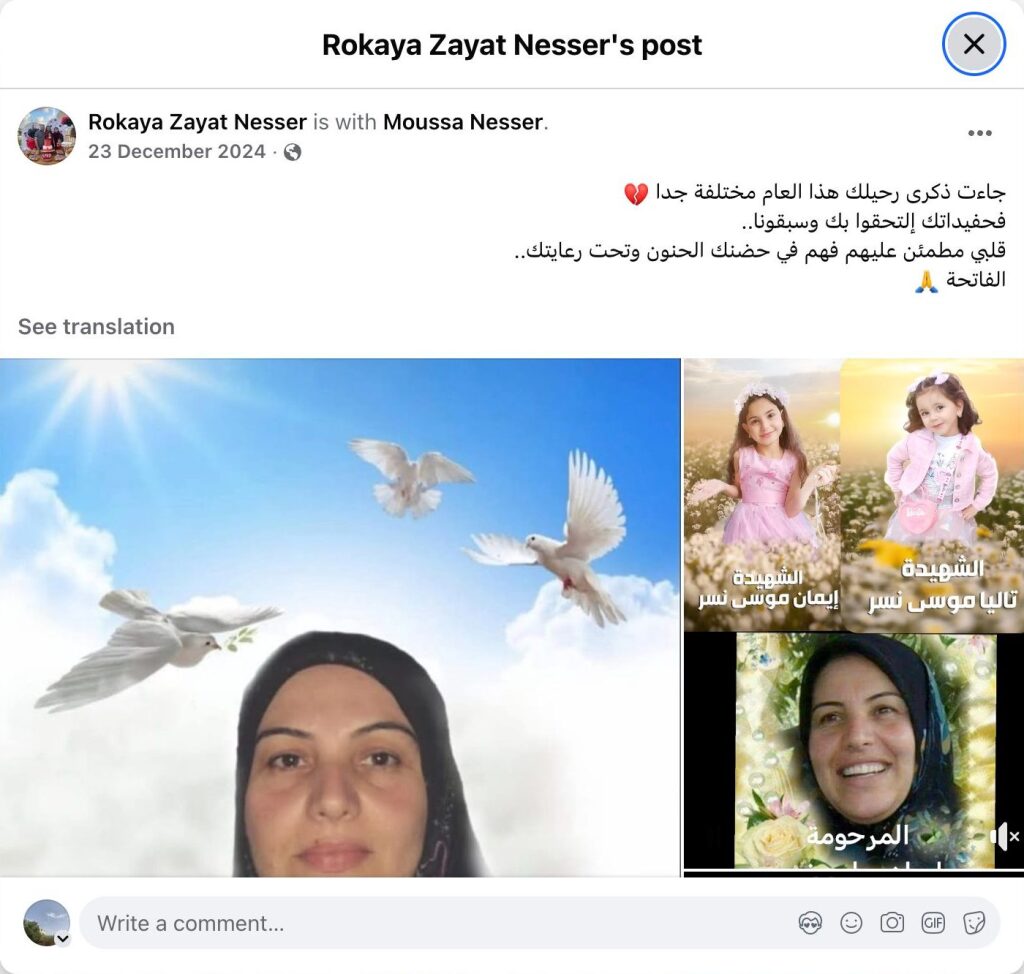 Archive URL: https://airwars.org/source/www-facebook-com-rokaya-zayat-nesser-pfbid0cbyu9w4dftl5txm2aejkvd4tugpeutdbm2bg4qm4vdg9scvsxar37rycaohsdt4xl-2024-12-23-120000/