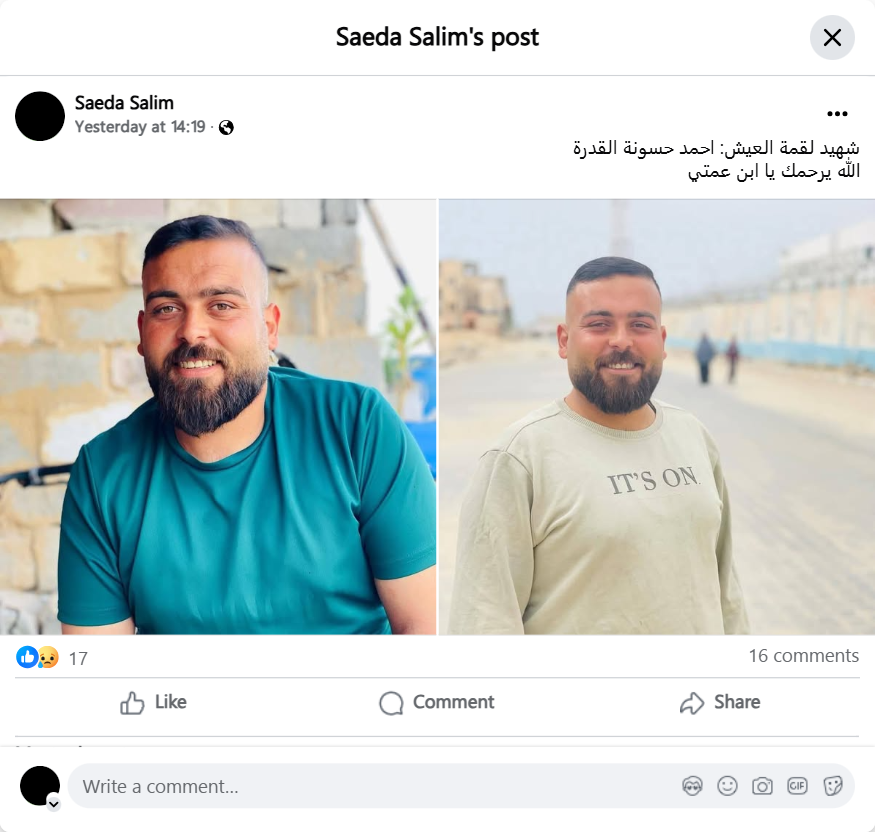 A martyr for the livelihood: Ahmed Hassouna Al-Qudra. May God have mercy on you, my cousin.