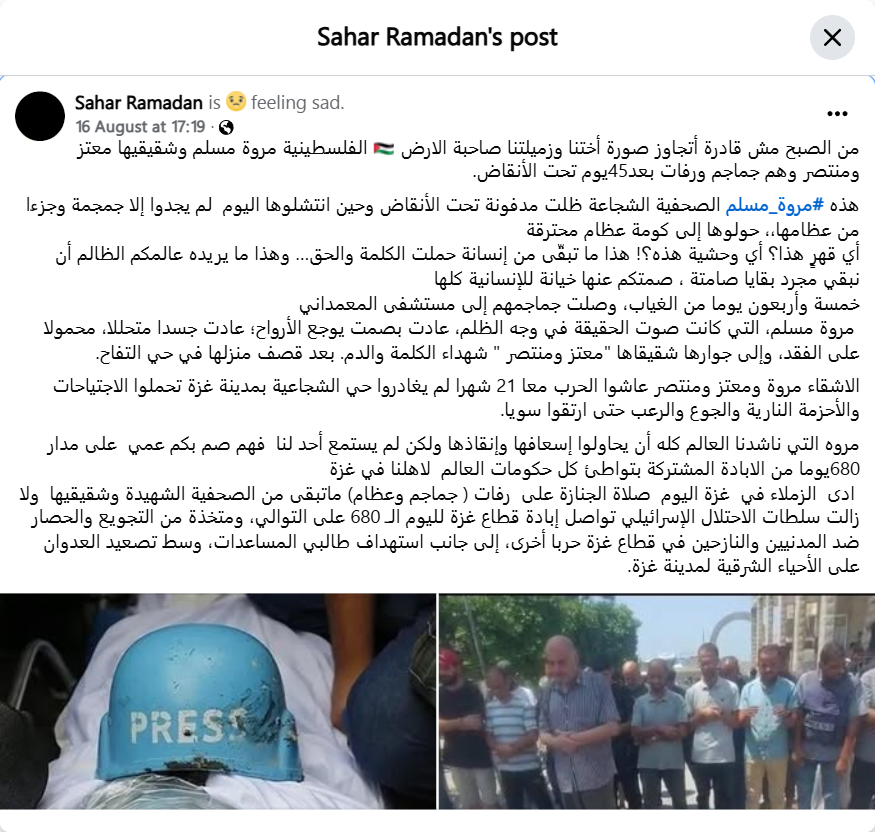 ادى الزملاء في غزة اليوم صلاة الجنازة على رفات ( جماجم وعظام) ماتبقى من الصحفية الشهيدة وشقيقيها ولا زالت سلطات الاحتلال الإسرائيلي تواصل إبادة قطاع غزة لليوم الـ 680 على التوالي، ومتخذة من التجويع والحصار ضد المدنيين والنازحين في قطاع غزة حربا أخرى، إلى جانب استهداف طالبي المساعدات، وسط تصعيد العدوان على الأحياء الشرقية لمدينة غزة.